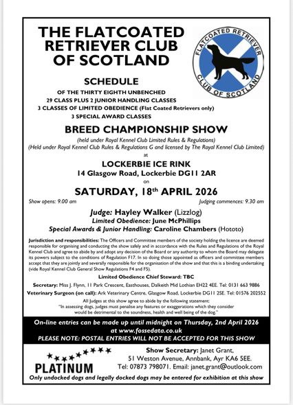 Kirkintilloch, Lenzie & District Canine Society 26/04/2026 - FCR classes - G, Open Judge: Simon Pitts (Wandsfell/Larrenie). Postal closing 04/04/2026, Online 11/04/2026 at 1pm. Details: www.mbjprint.co.uk